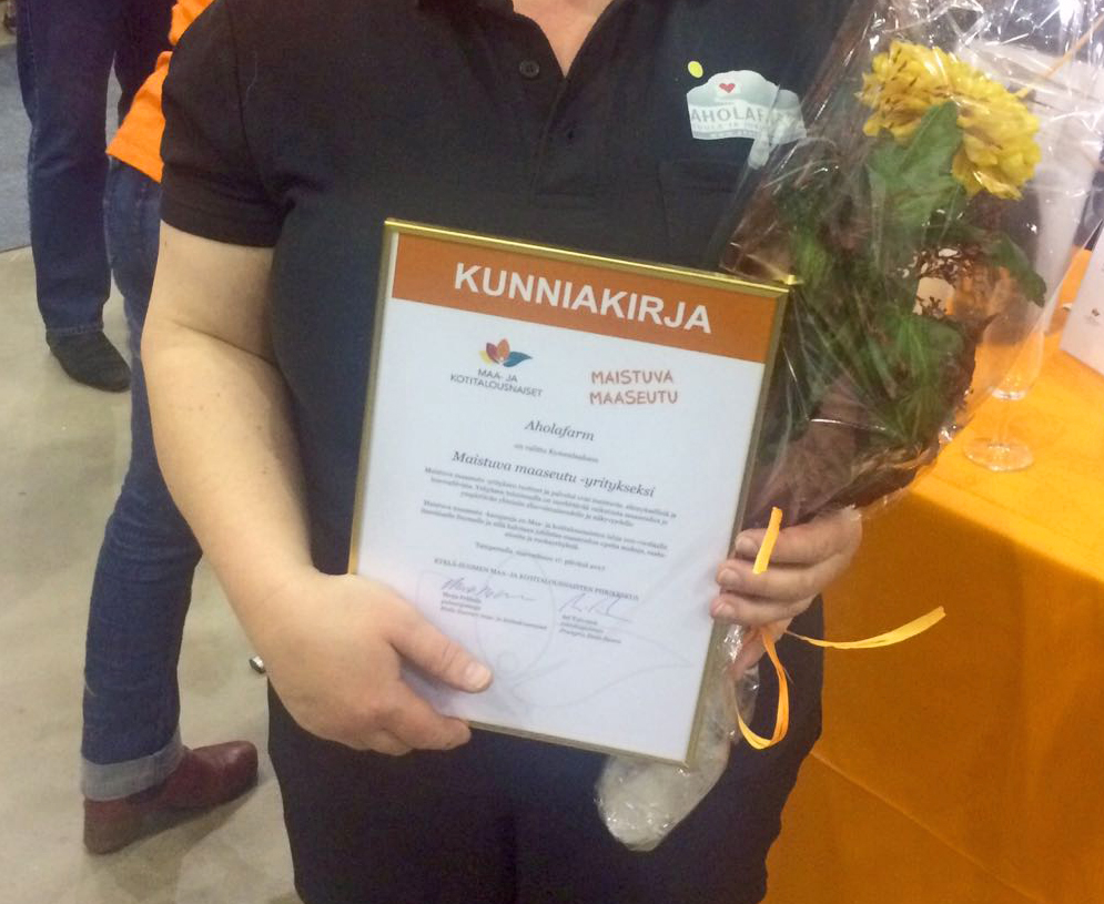 Aholafarm sai kunnian ottaa vastaan nimityksen ”Kymenlaakson maistuva maaseutuyritys”.